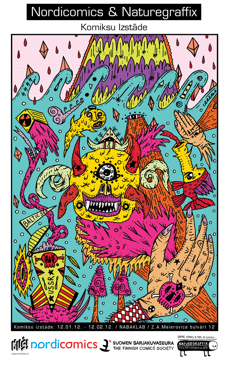 The workshop and exhibition were organized in collaboration with Kuš!komikss and Naturegraffix and funded by Nordic Culture Point.